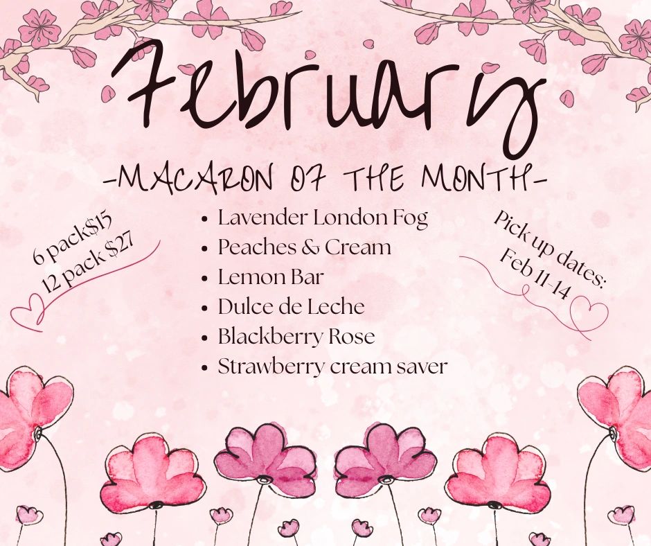 Here is your chance to try a variety of macaron flavors. Each month is a different set. To keep up to date on the flavors, order dates and pick up dates, go to my Facebook page. To order, just send me a message.