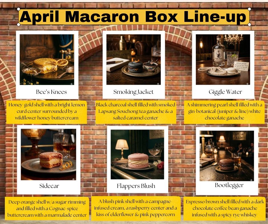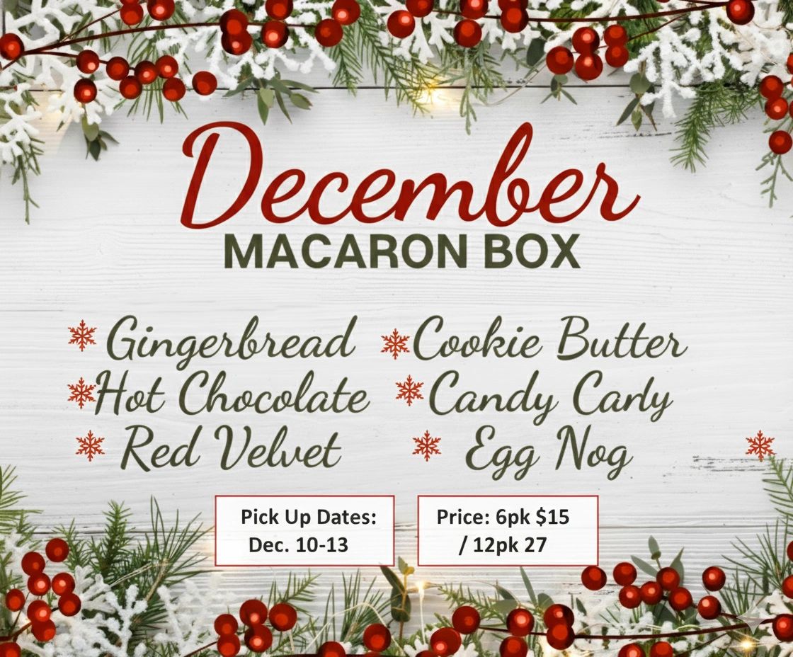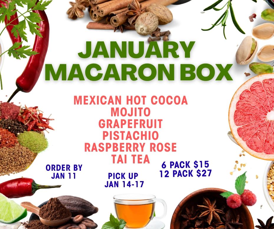 Here is your chance to try a variety of macaron flavors. Each month is a different set. To keep up to date on the flavors, order dates and pick up dates, go to my Facebook page. To order, just send me a message.