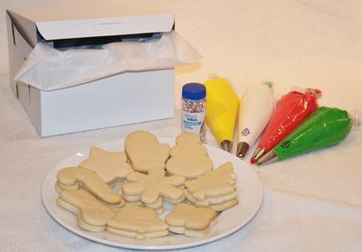 The kits come with 24 pre-baked cut-out sugar cookies, 4 colored frosting bags with assorted decorating tips and lots of sprinkles.
